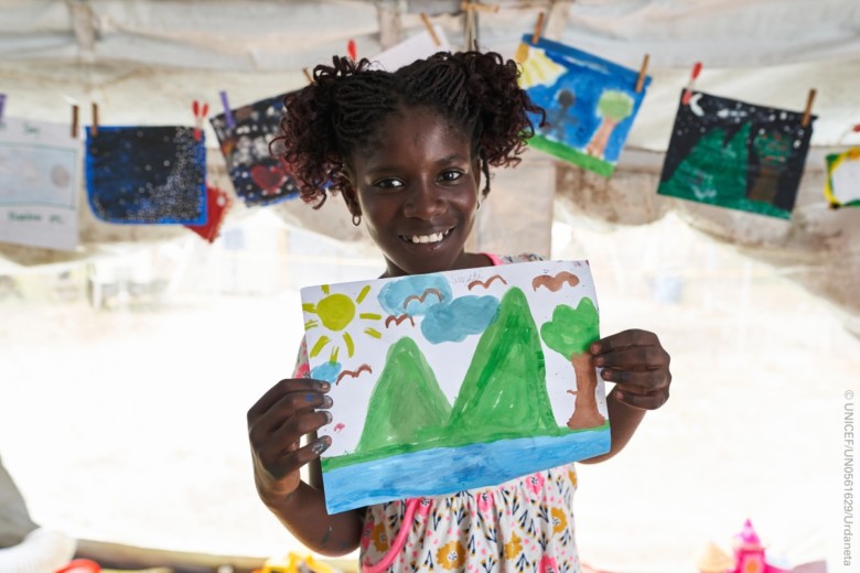 Drawings made by migrant children at UNICEF´s Child Friendly Spaces in a migration reception center in Darien, Panama.